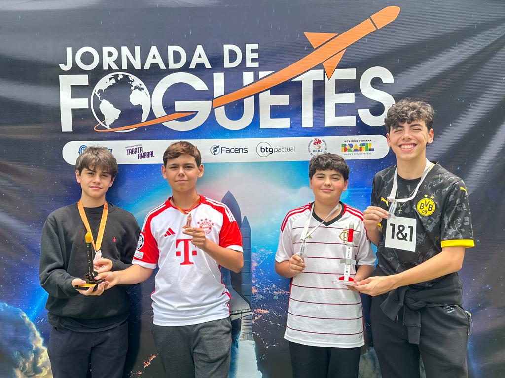 Os alunos João Z., Ian G., Daniel F. e Rafael M., das turmas 8C, participaram da Mostra Brasileira de Foguetes de 2023.