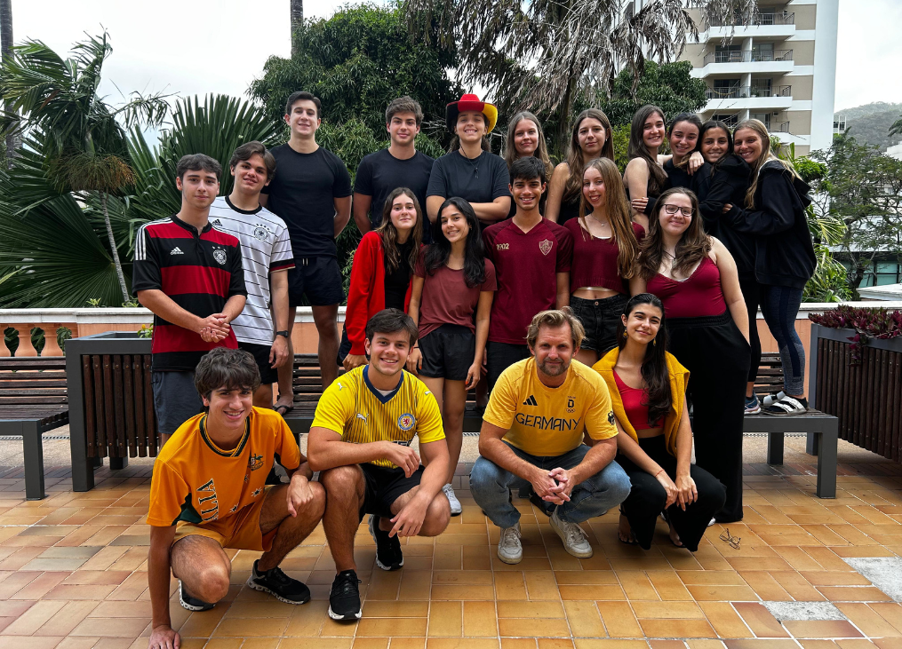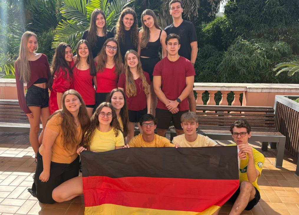 Já as turmas 12, do ramo alemão, encontraram outra forma de homenagear a data: os alunos vestiram roupas com as cores da bandeira alemã, reforçando o sentimento de pertencimento e reconhecimento desse marco histórico.