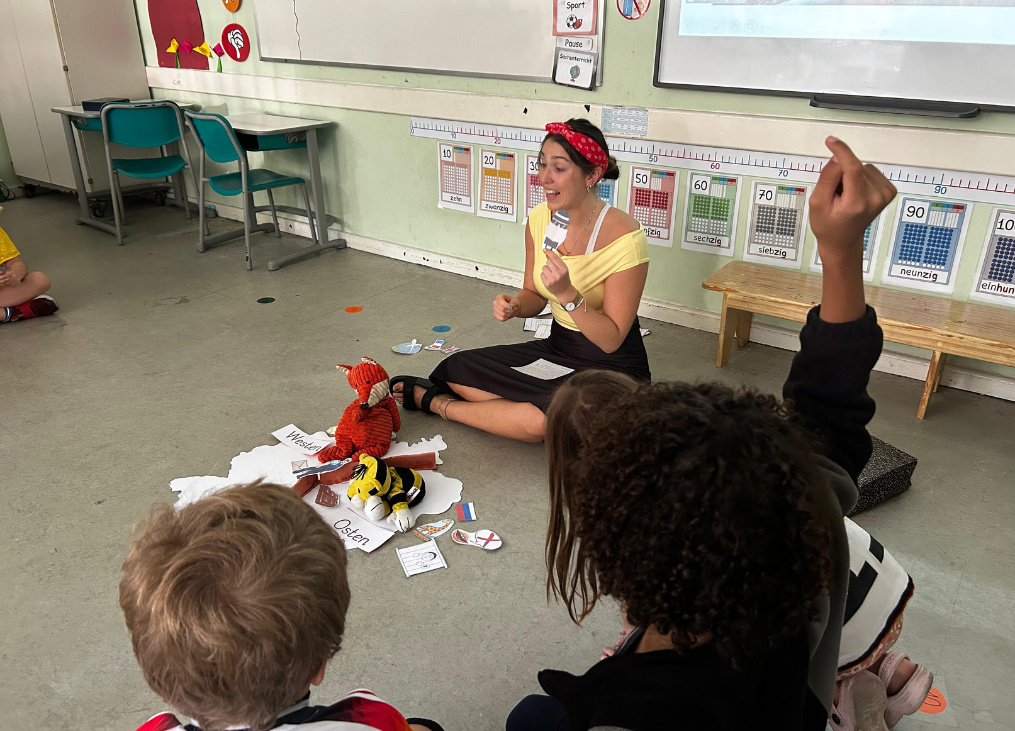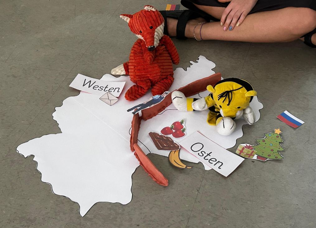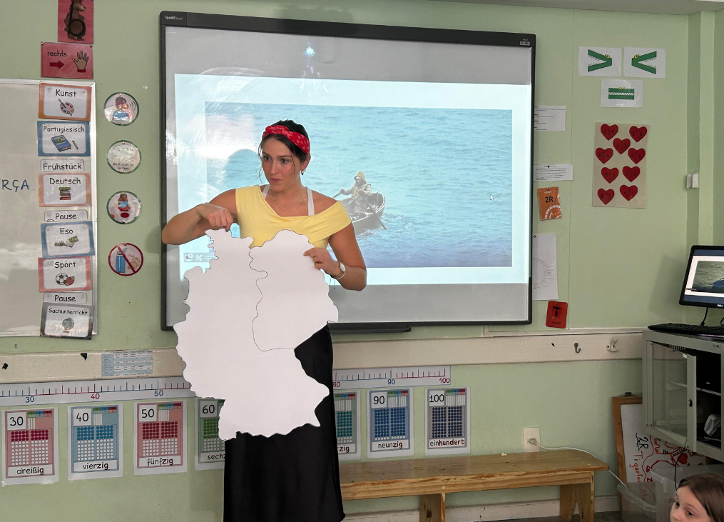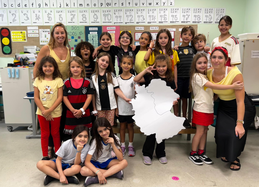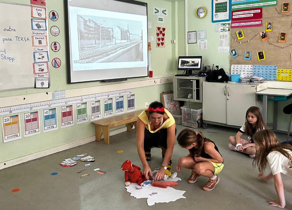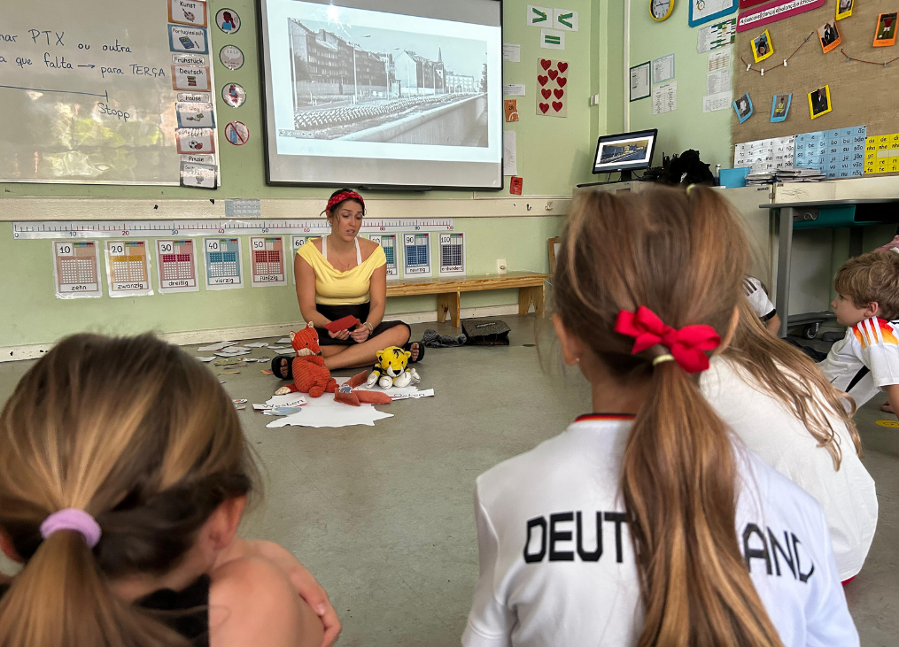 Aqui, o tema foi lembrado de maneira especial em diferentes turmas. Os alunos da turma 2, do ramo alemão, participaram de uma atividade conduzida pela professora Natalia Hermann, que apresentou a história da Alemanha dividida e o processo de reunificação. Para tornar o conteúdo mais próximo da realidade das crianças, ela utilizou mapas, pelúcias e cartas, incentivando a interação e despertando a curiosidade deles durante a aula.
