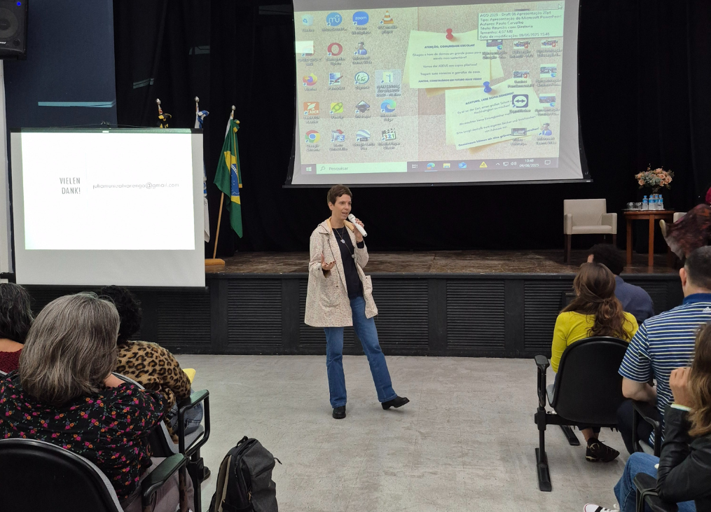 Lia Vainer abordou as relações étnico-raciais no ambiente escolar convidando a equipe para uma reflexão aprofundada sobre a branquitude e Julia Alvarenga trouxe considerações sobre as questões de gênero na escola e como podemos pensar ações efetivas ligadas à temática.