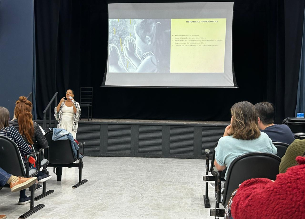 Durante a formação, discutimos os impactos das novas tecnologias na saúde mental de crianças e jovens, além dos desafios das interações no contexto escolar.