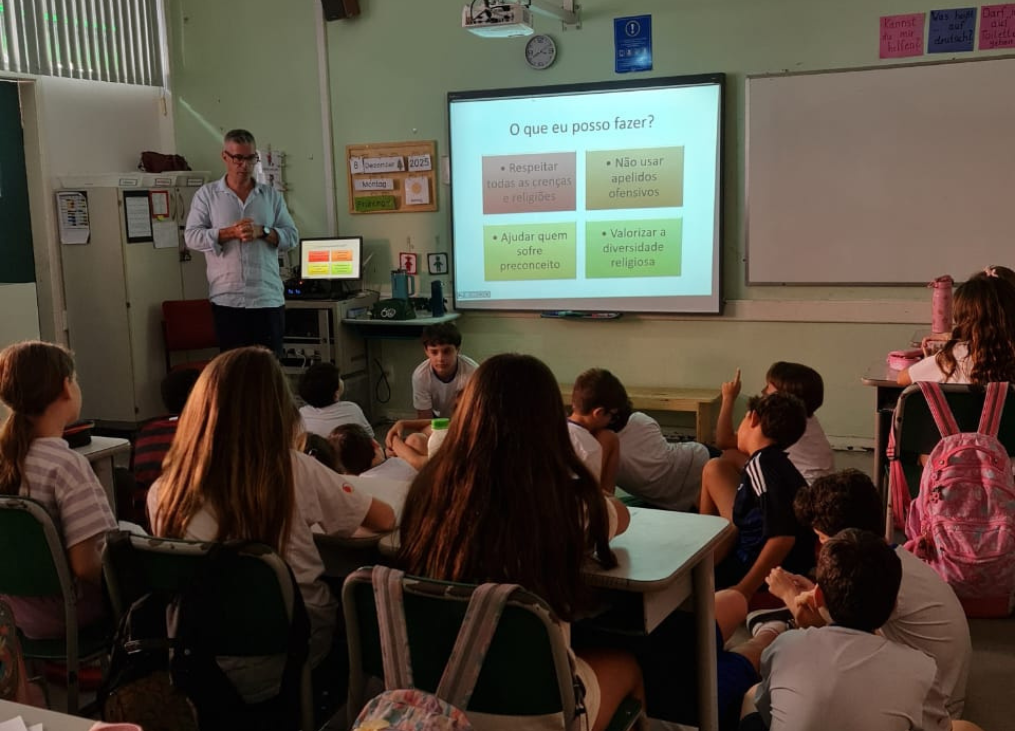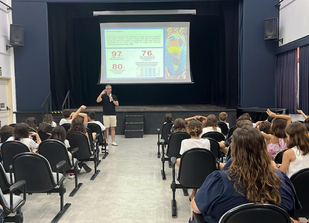 tiveram uma aula especial com o professor de Geografia Marcelo Alonso, que abordou o tema da intolerância religiosa. Os estudantes aprofundaram seus conhecimentos sobre o sincretismo religioso como forma de resistência dos povos de origem africana e conheceram dados atuais sobre casos de racismo religioso no Brasil.